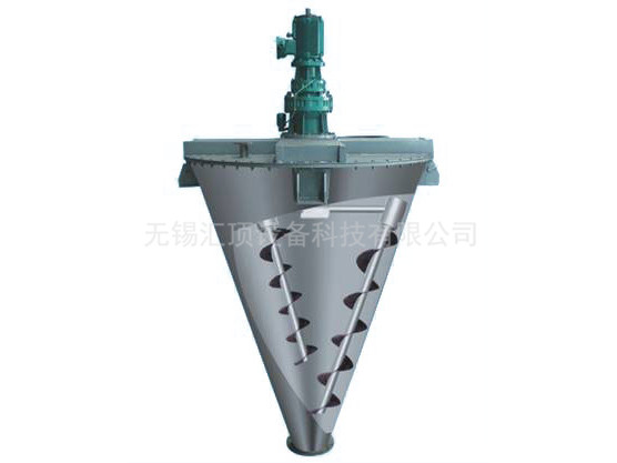 混合機筒內的兩只非對稱螺旋的快速自轉將物料向上提升,形成兩股非對稱沿筒壁自下向上的螺柱形物料流,轉臂帶動的螺旋公轉運動,使螺旋外的物料不同程度進入螺柱包絡線內,一部分物料被錯位提升,另一部分物料被拋出螺柱,從而達到合圓周方位物料的不斷擴散,被提到上部的兩股物料再向中心凹穴匯合,形成一股向下的物料流,補兗了底部的空穴,從而形成對流循環。由于上述運動的復合,物料在短時間內獲得了均勻混合,混合精度較高。